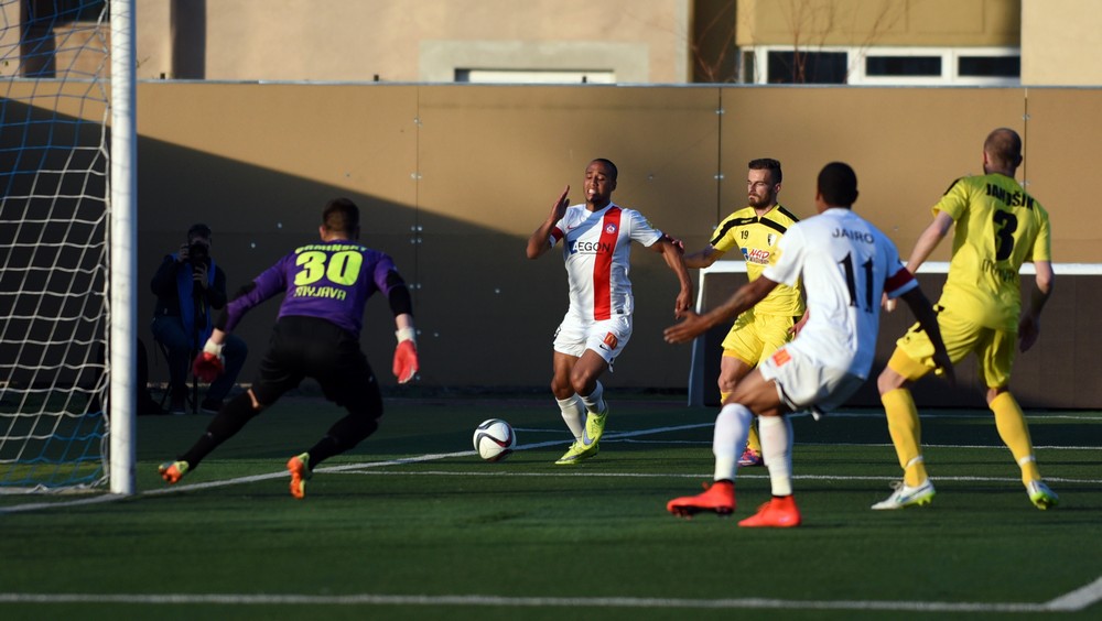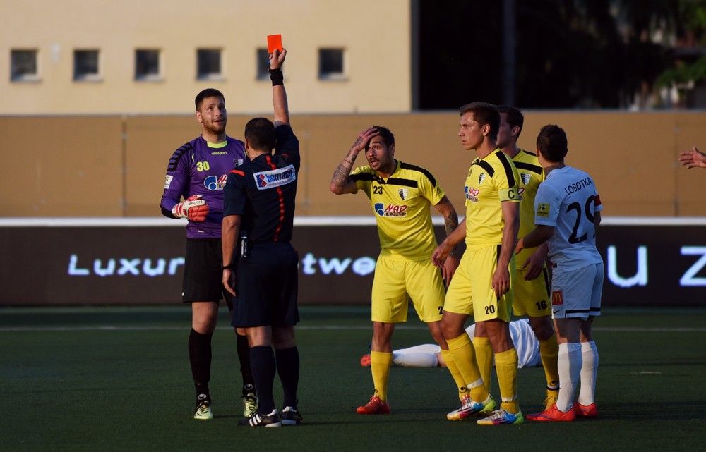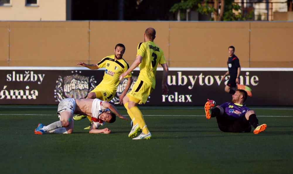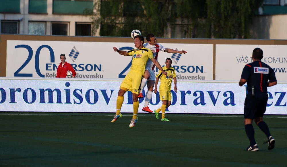 Úvod zápasu nevyšiel AS celkom podľa predstáv. Fanúšikov na tribúnach vystrašilo drobné zaváhanie Šemrineca, ktorému spätná prihrávka od Rundiča takmer ušla za bránkovú čiaru. Pozornosť domácich divákov narušilo a niekoľko nepresných prihrávok smerujúcich na súperove kopačky a za postrannú čiaru. S pribúdajúcimi minútami sa hra AS lepšila a prišli aj šance. V 9. min poslal loptu do siete Ramón, ale stál v postavení mimo hru. Myjava sa snažila využívať našu nepresnosť na nebezpečné brejky a následné štandardné situácie na skórovanie. V 11. min hlavičkoval po rohovom kope Kuzma, Šemrinec ale loptu bravúrne vyrazil. O desať minút neskôr vystihol rozohrávku hostí Guba, Urminský však dobre vybehol mimo pokutové územie. Krídelník AS ho už nedokázal obhodiť. Ďalšia šanca prišla v polovici prvého polčasu. Bero si nabehol na kolmú prihrávku. Rútil sa sám na Urminského, ktorý ho fauloval. Gólman Spartaka dostal červenú kartu a pokutový kop proti Solničkovi premenil Rundič. Myjava sa ani v desiatich nepoddala. V 37. min sa jej podarilo vyrovnať. Po priamom kope sa hlavičkou presadil Marček – 1:1. O dve minúty Pekárovu strelu Šemrinec vyrazil špičkami prstov nad bránku.
